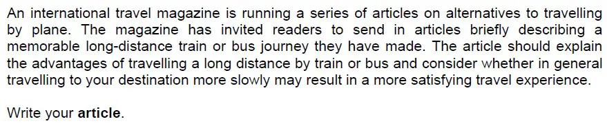 Looking at this article task, we have to think about the typical conventions of an article (layout, engaging language, describing and explaining something, neutral to informal tone, etc.), as well as which topic points are rather straightforward (briefly describing a journey) and which ones more complex to address (explain advantages; Is travelling more slowly more satisfying?). Feel free to have a look at what I did to express all these ideas.